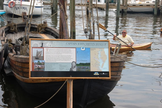 A kayaker paddling the St. Michaels Harbor checks out the replica John Smith shallop now on display just outside of the Chesapeake Bay Maritime Museum (CBMM) in St. Michaels MD. Built in 2005 by Sultana Projects, the John Smith shallop will be along the harbor and near Honeymoon Bridge in St. Michaels for an extended length of time.