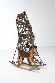 Alexandra Bircken, Pferdchen, 2008. Rocking horse (wood), knots, bolts, wool. 13.75 x 88.5 x 36 cm