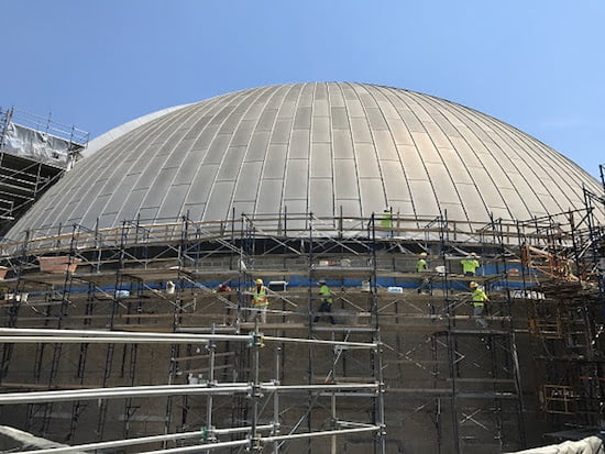 With warm weather and clear skies, nearly 260 crew are working outside, inside, above and below Union Terminal every day. As work wraps up in one area it begins in another, with multiple projects ongoing simultaneously across the building. Four to five cranes are scattered around site, moving bricks to rebuild walls and lifting new mechanical equipment into place. Repaired glass with new glazing is being reinstalled on the front of the Rotunda and in the wings of the building. Roofers are braving the summer heat on the roofs of the building’s south wing, working level-by-level down the three-tiered roof to replace and reinsulate the roofs.